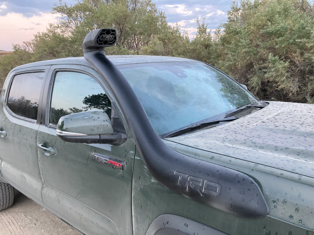 The TRD Pro trim is the top of the line off-road spec for the Tacoma. Our review truck even had a few optional extras, like the Desert Air Intake Package ($725). This is a raised air intake but isn’t fully sealed at the airbox, so does not increase the river fording depth capability. It does, however, allow the engine to draw cleaner air, which is especially helpful when traveling in convoy in dusty conditions. We also had some optional tie-down points in the bed which proved useful for our particular load heavy adventure.