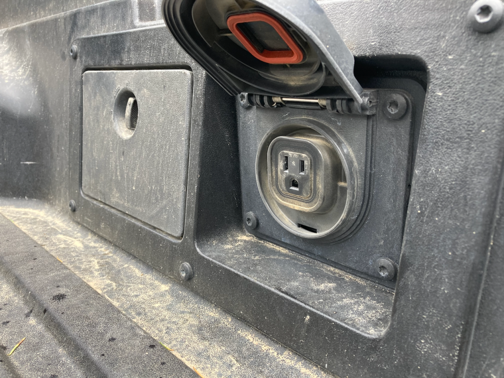 In the bed of the truck is a 100w/400w AC plug which worked out nicely for us. We hauled all our food in an electric Dometic fridge to transfer to the cooler that came with the raft we rented. The in-bed plug only runs at 400w when in Park, however. This is handy on a job site when you might want to run power tools. Once shifted into Drive, the plug drops to 100w, which was totally fine for our cooler. The catch with hauling a fridge, however, is every time the vehicle was turned off and on again, say to fuel up, I had to remember to turn the AC socket back on to keep the cooler running. It would otherwise warm up pretty quickly in the 90+ degree heat we were driving through.