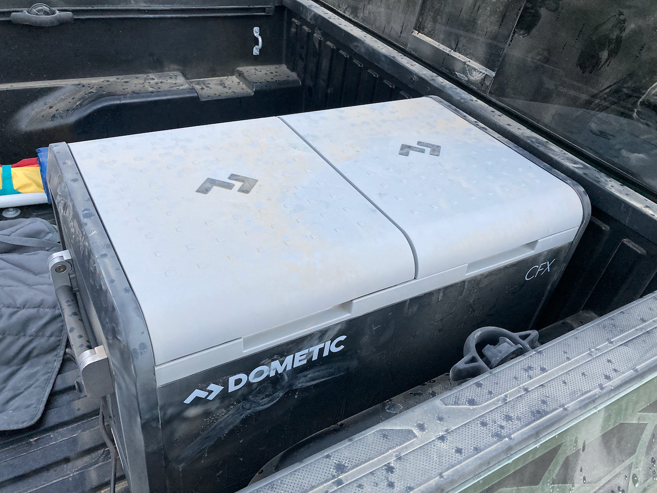 In the bed of the truck is a 100w/400w AC plug which worked out nicely for us. We hauled all our food in an electric Dometic fridge to transfer to the cooler that came with the raft we rented. The in-bed plug only runs at 400w when in Park, however. This is handy on a job site when you might want to run power tools. Once shifted into Drive, the plug drops to 100w, which was totally fine for our cooler. The catch with hauling a fridge, however, is every time the vehicle was turned off and on again, say to fuel up, I had to remember to turn the AC socket back on to keep the cooler running. It would otherwise warm up pretty quickly in the 90+ degree heat we were driving through.