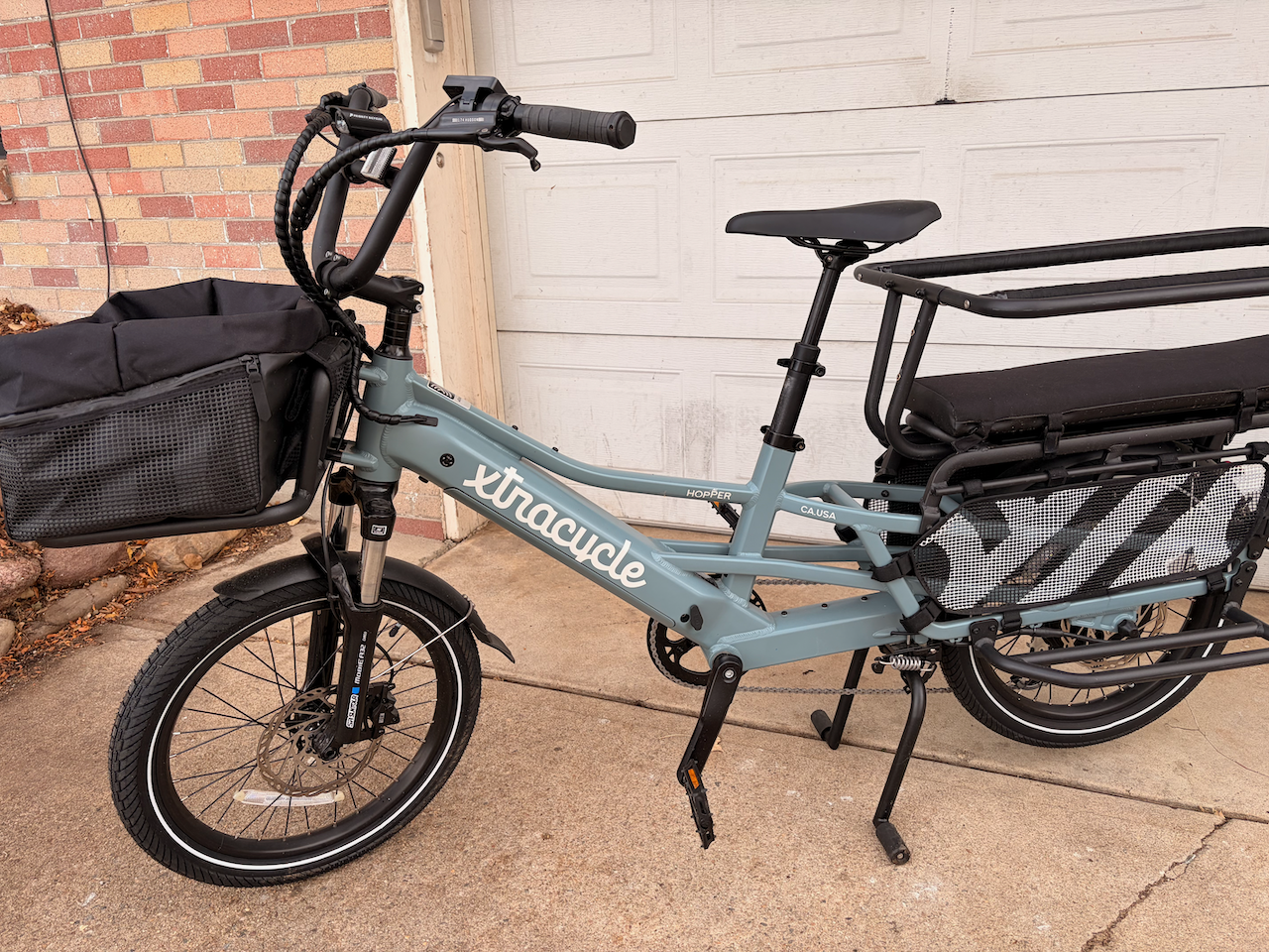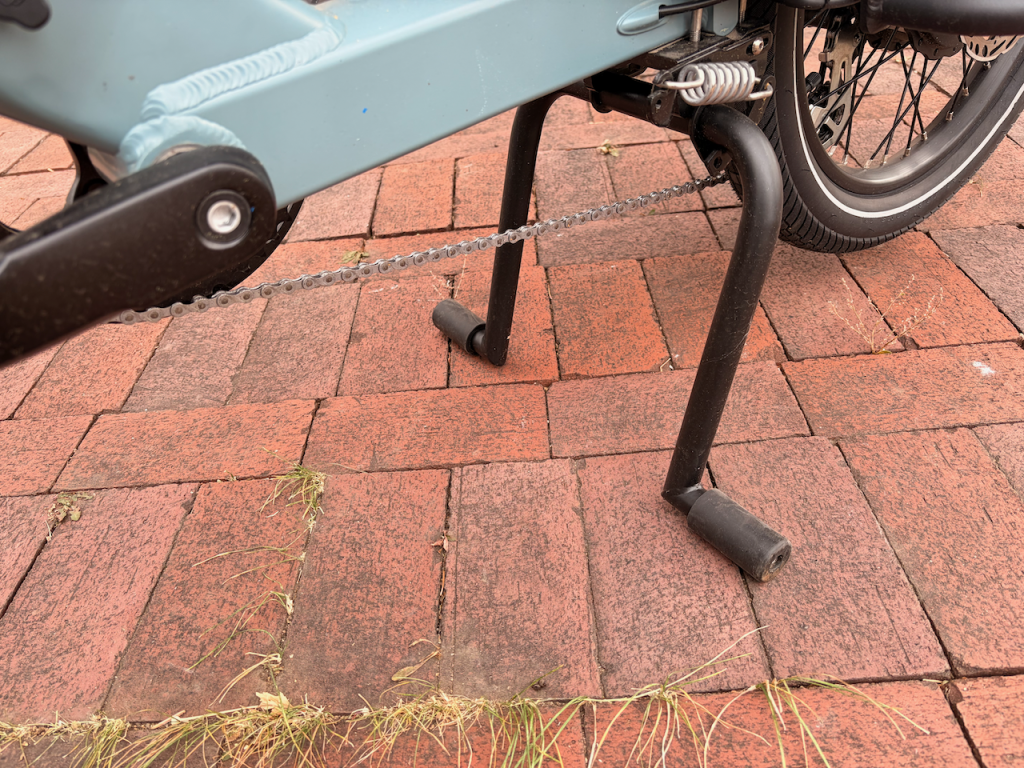 The other feature I really like about the Hopper is the kickstand. It’s even better than the one on the Xtracycle Swoop. It has a nice wide base and two little feet that reach out the sides so it works really well on lots of surface types including soft grass or gravel. Our Swoop 2.0 has a peg-leg style stand and it does not work well, if at all, on grass.