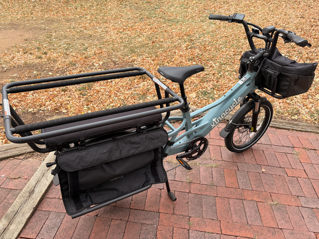 - Pannier bags Velcro on, pretty involved to add and remove but they do fold relatively flat so they can stay on when taking the kiddos out—though, the thickness of the pannier bags take up half of the running boards when folded flat. Otherwise, panniers are nice hard-sided, square-bottom with great buckles. I’d like to see a better integration with the running boards when stowed.